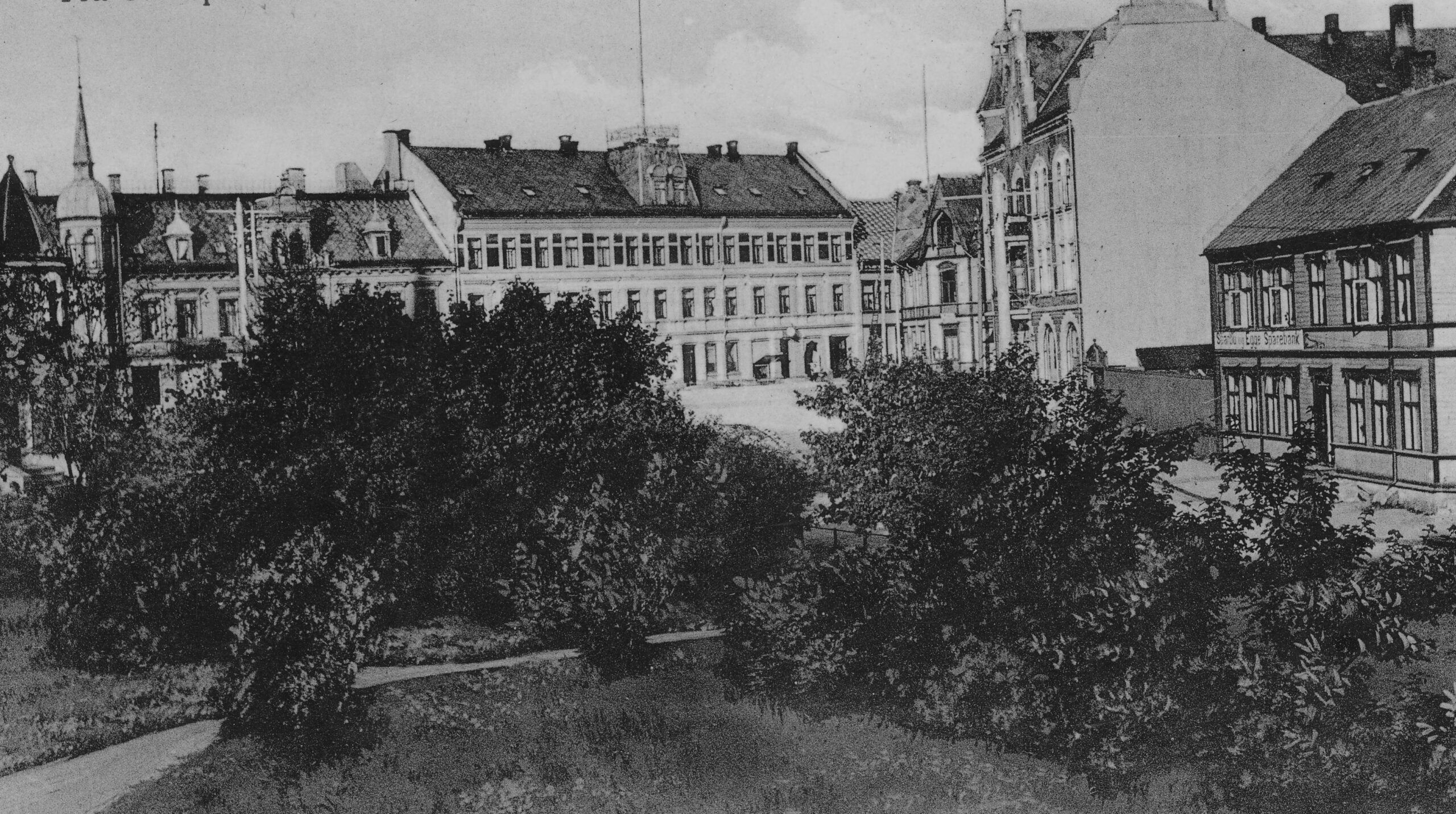 Berget mye: Her ser vi «Kommunegården» som den tredje gården på venstre side, i krysset av det som i dag er Kirkegata og Ogndalsvegen. Bak ser vi gjerdene til fengselet.Mistet alt: Familien Strugstad bodde i andre etasje i bygården tilhørende Sparbu og Egge Sparebank – til høyre i bildet.