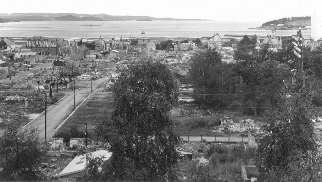 Vi ble værende i ”Fotaplassen” natta over. Men neste dag ble det bestemt at vi skulle prøve å komme oss oppover Ogndal, og vi klarte å få tak i en som kunne kjøre oss med bil. For å komme oss fra Skjefte og opp gjennom Ogndal, måtte vi helt ned til ”Hansenvillaen” på Sørsibakken. Da vi kom på kanten ovenfor Regimentsboligen, kunne vi se ut over byen. Det vi så sitter fremdeles på netthinna. Jeg kan se for alle skorsteinene og branngavlene som stod igjen. Jeg kan huske at mamma sa: ”Ikke se!” og at hun gråt.