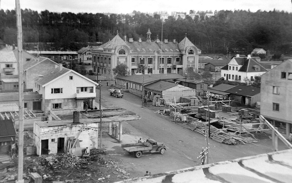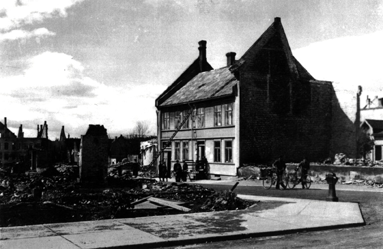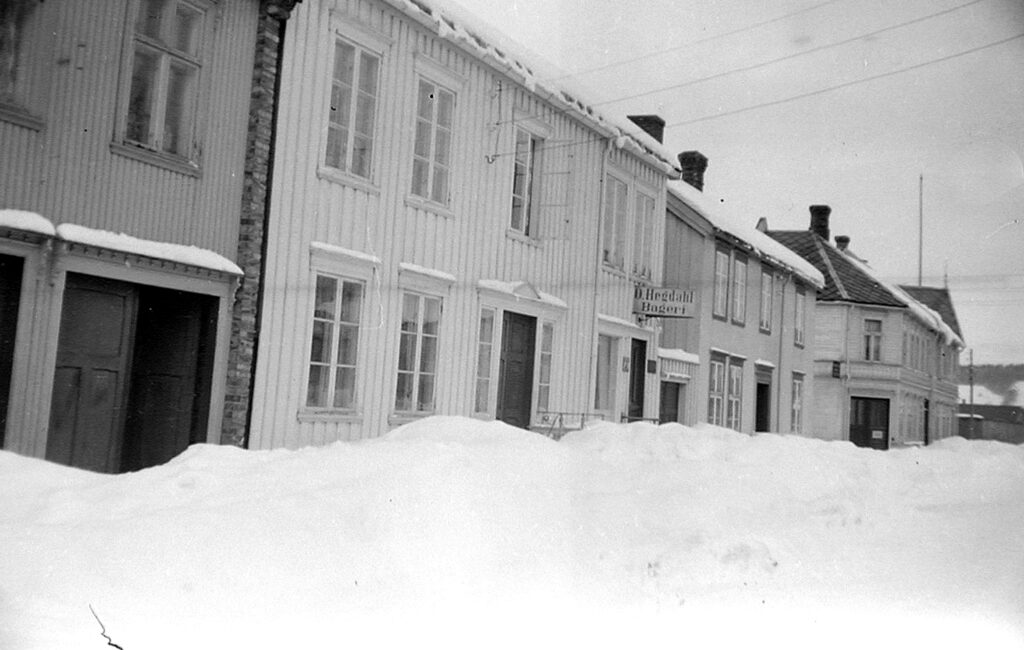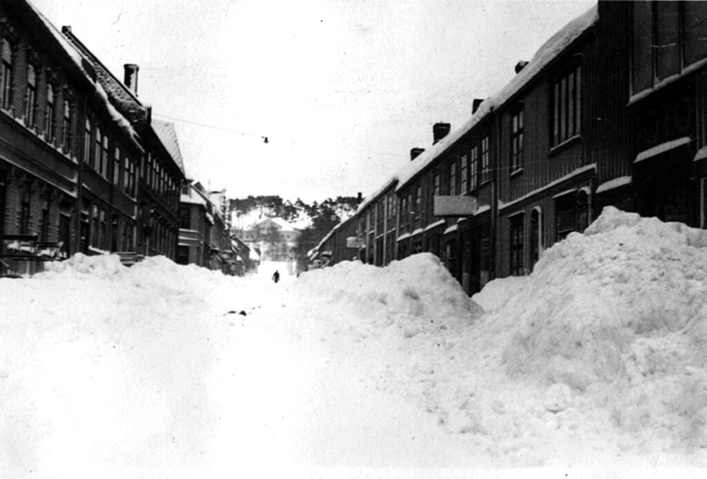 Vinteren 1940 var det usedvanlig mye snø, og det ser nærmest ut som om man har gitt opp å rydde i bygatene. Bildet er tatt like ovenfor krysset mot Kongens gate. Til venstre på bildet ligger først Myrslogården, deretter Asm. Hoseths gård og øvert på hjørnet mot Sverres gate som vi så vidt aner ( i dag Skolegata) lå Rich. Weigners gård. På neste gatehjørne på venstre side skimter vi den karakteristiske «knekken» på Asbj. Ytrelands gård (der tannlege Rye i dag har kontor i 1. etasje). Videre oppover følgende hus: Søstrene Kvam, Thoresen, S. B. Grande og Kløvstad.