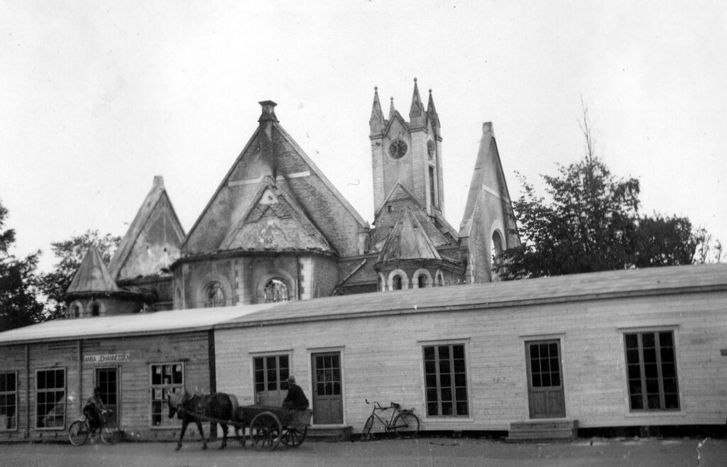På høyre side ser vi den øverste delen av P. H. Bjerings store forretningsbygg, som for øvrig hadde adresse Kongens gt. 1. Det neste huset tilhørte Ogndal kommune, og rommet blant annet Ogndal Handelsforening, mens hjørnegården mot Sverres gate var skredder Vikans. Vi kan også skimte noen bygninger videre oppover på høyre side – først J. Suseggs gård, deretter Røsæg-gården, Setten-gården og helt øverst mot Øvre Tverrgate (i dag Kristofer Uppdals gate) lå baker O. Hegdahls forretningsgård med bakeri og utsalg.